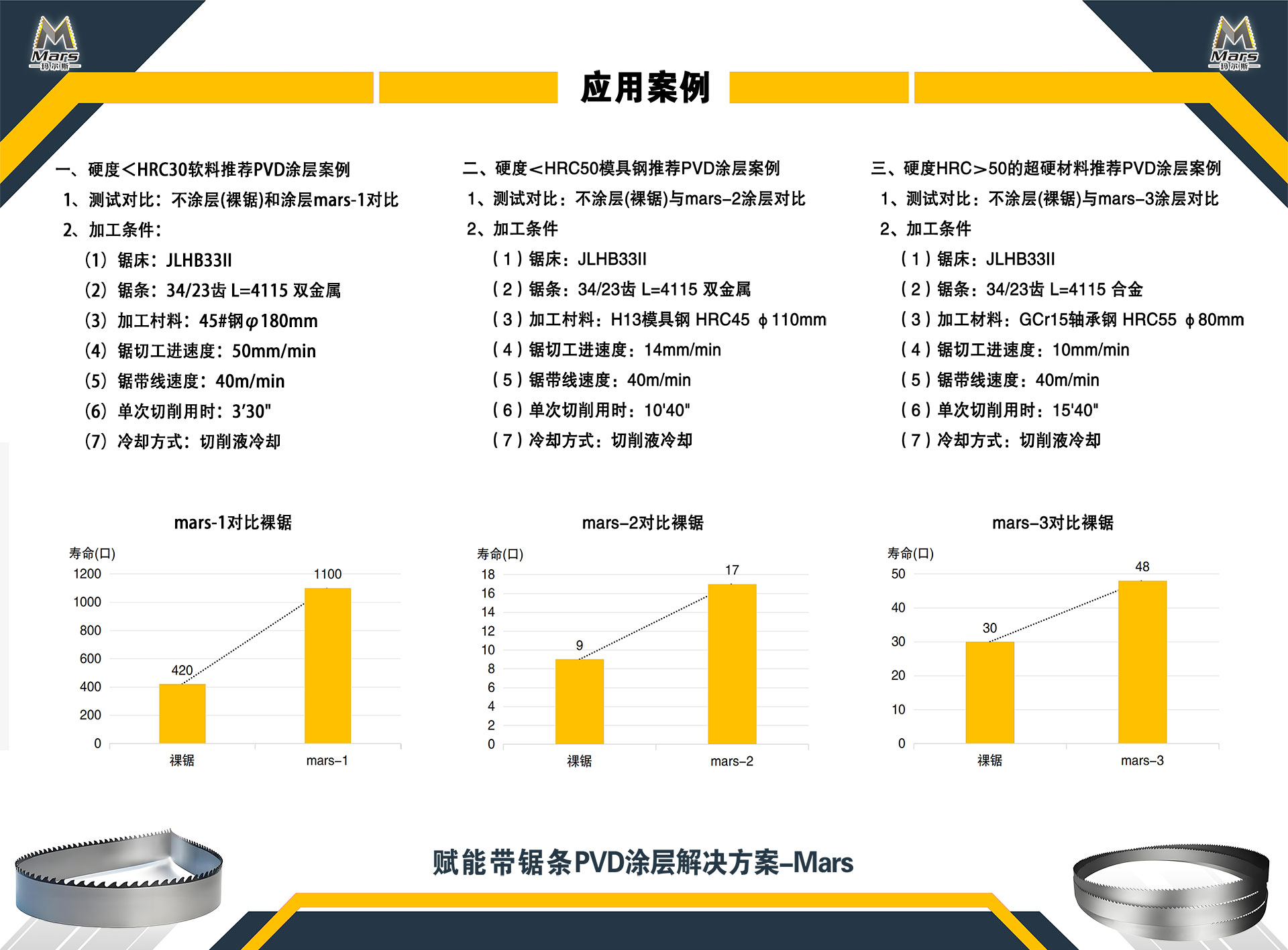 現(xiàn)有涂層有mars-1、mars-2等涂層解決方案,主要應用于雙金屬帶鋸條,mars-3涂層解決方案,主要應用于硬質合金鋸條。